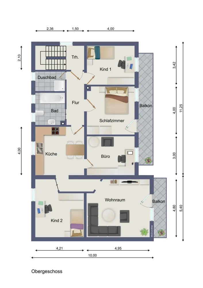 Die Obergeschosswohnung hat 5 Zimmer, Küche, 2 Bäder und zwei Balkone. Mit ca. 124 m² ist dies die perfekte Familienwohnung.