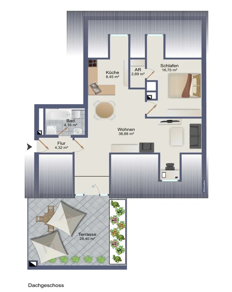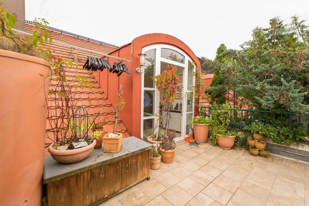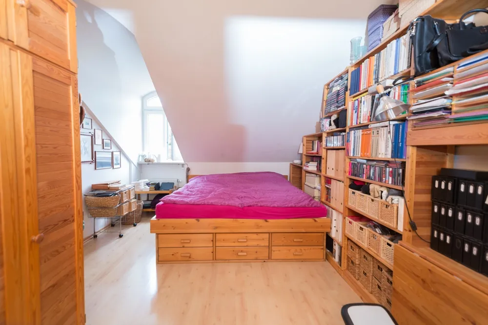 Auf der ca. 28 m² großen Dachterrasse genießen Sie nach einem anstrengenden Arbeitstag die Ruhe und grüne Umgebung. Das Schlafzimmer bietet auf 17 m² genügend Platz für Ihr Bett und Möbel. Vom Schlafzimmer aus haben Sie Zugang zu der Abstellkammer.