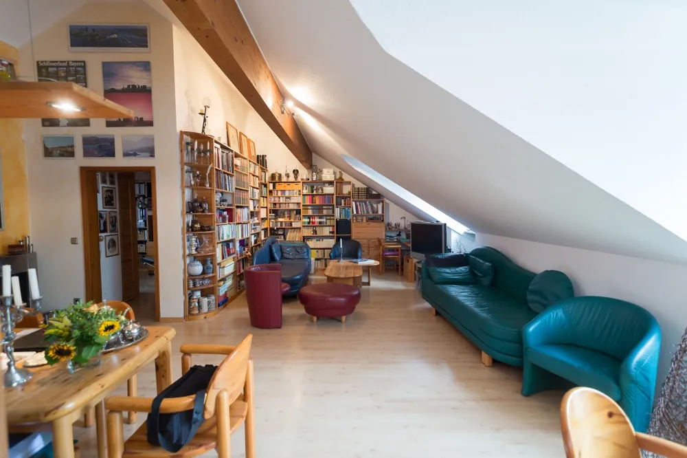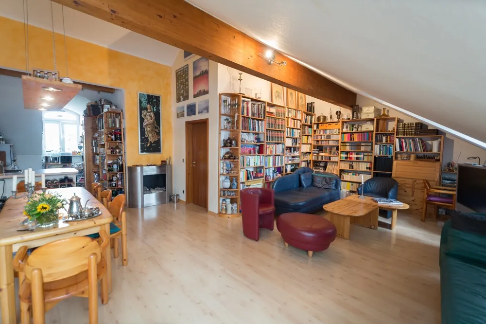 Vom Wohn- und Essbereich gelangen Sie sowohl in die Küche, Schlafzimmer und die Dachterrasse. Dank der hoch geöffneten Räume bis hin zum Dachspitz erwartet Sie ein sehr gutes Raumklima. Neben der Terrassentür belichtet ein schwungvolles Gaubenfenster den Raum. Auf knapp 39 m² können Sie hier genießen. Die offene Küche bietet Gelegenheit beim Kochen mit den Freunden oder Familie zu kommunizieren.