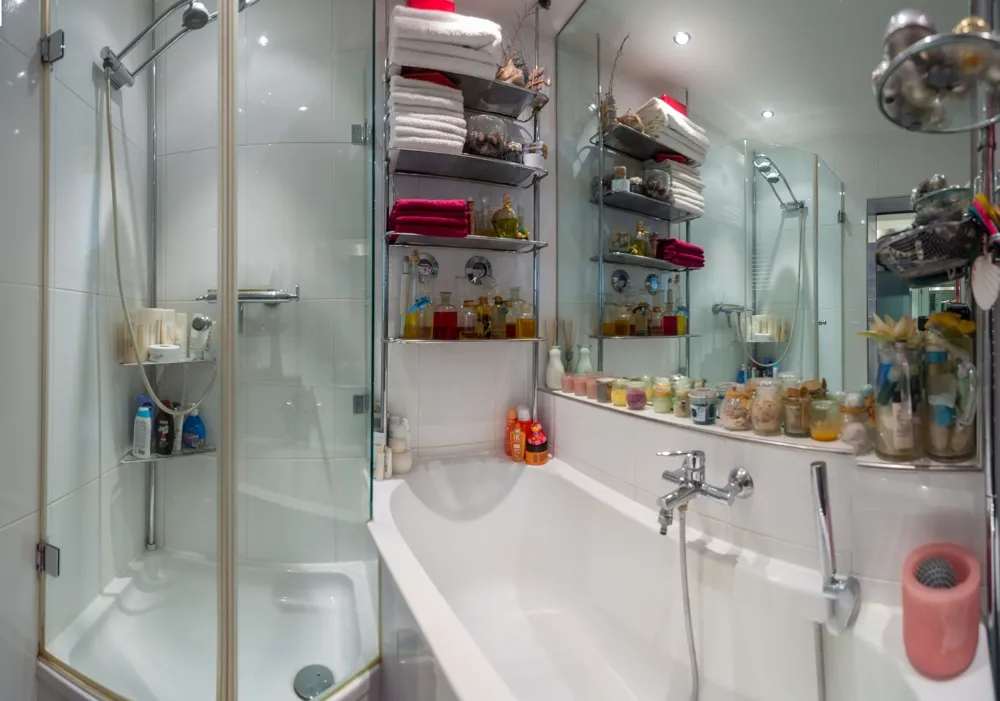 Zur Linken befindet sich das geschmackvolle Badezimmer. Hier genießen Sie in Ihrer eigenen kleinen Wohlfühloase entweder die Badewanne oder Dusche. Raffiniert gestaltete Regale bieten genügend Platz für alle benötigten Pflegeprodukte. Selbst ein Handtuchwärmer ist installiert.