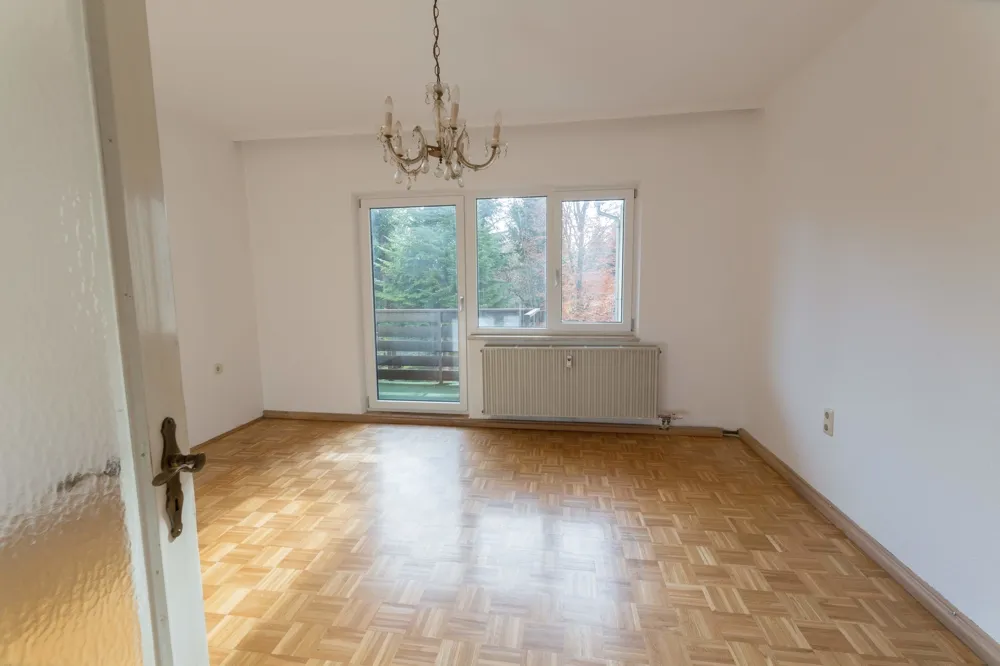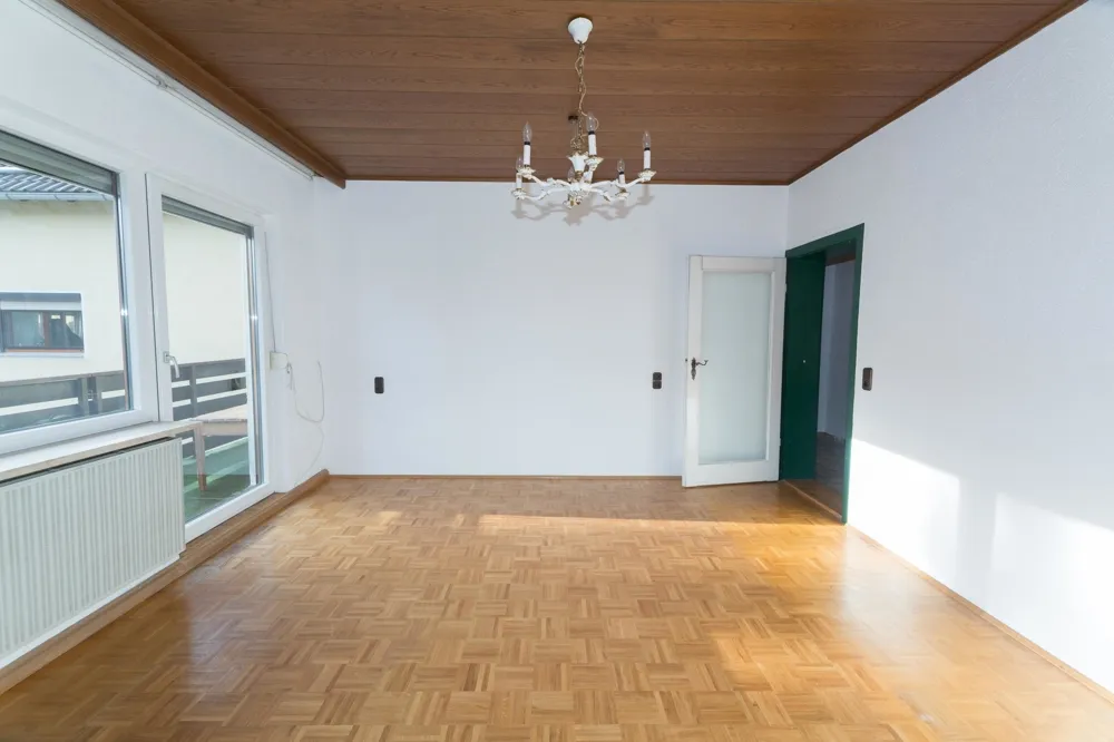 Direkt daneben befindet sich das große Wohnzimmer. Auch hier haben Sie genügend Platz für Sofa, Kommode und TV-Wand. Von beiden Räumen gibt es Zugang zum Balkon.