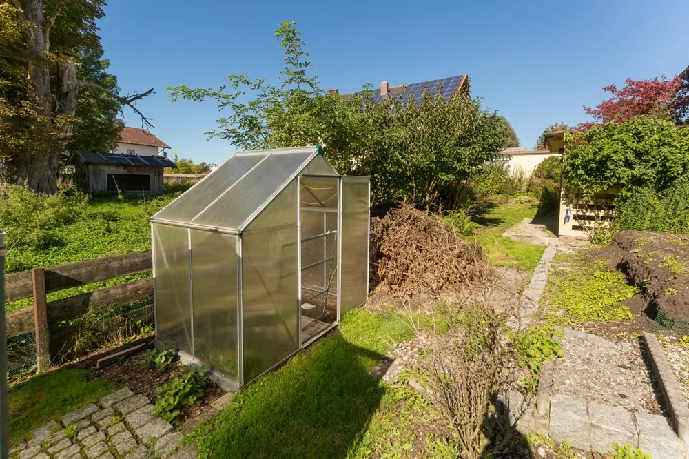Ein Wort zur Terrasse und Garten: fantastisch. Ein absolutes Highlight! Hier ist die Sonne zu Hause, sie scheint von vormittags um sieben bis in die Abendstunden. Sie werden im Sommer wundervolle Nachmittage und Abende mit Freunden und der Familie verbringen. Der Garten ist bildschön und bereits angelegt. Im Bereich der Terrasse finden Sie einen gepflegten Rasen sowie Blumenbeete, Büsche und Sträucher. Gemüsebeete und Gewächshaus befinden sich auf der Westseite des Hauses.
