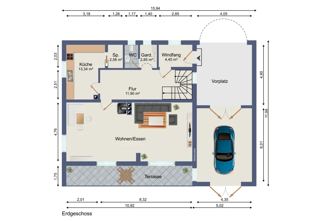 Das Erdgeschoss hat neben einer Garderobe und einem Gäste-WC ein großes Kamin-/Esszimmer sowie ein anschließendes Wohnzimmer mit sonnigen Fenstern nach Süden. Der Kamin sorgt für das nötige Wohlfühlambiente. Als besonderes Extra beheizen Sie den Kamin von außen im Flur, somit bleibt der Holzvorrat und Schutz außerhalb der Zimmer. Über beide Zimmer gelangen Sie auf die hausbreite Terrasse und den Garten. Sehr einladend ist auch der großzügige, helle Eingangsbereich. Hier haben Sie genügend Platz für Ihre Garderobe samt Schuhschrank. Die Küche bietet neben allen gängigen Küchengeräten viel Arbeitsfläche zum Kochen. Die Küchenutensilien verstauen Sie in den zahlreichen Schränken. Praktisch ist die Speisekammer, hier können Sie Ihre Lebensmittel lagern und auch so manche andere Kleinigkeit der Familie verschwindet hier.