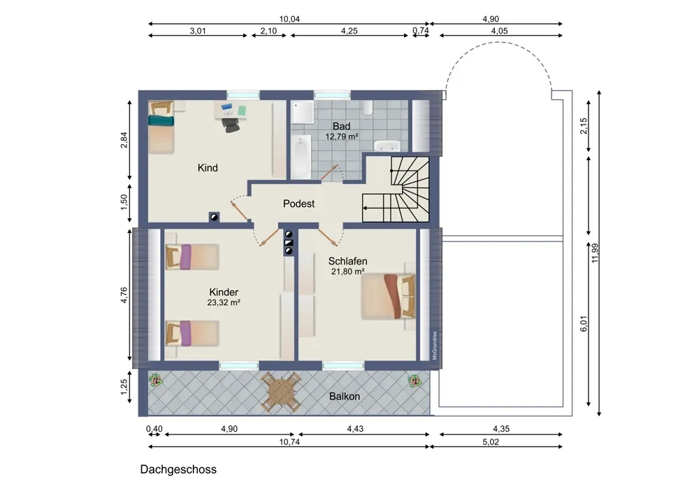 Noch mehr Leben finden Sie in drei weiteren Zimmern im Obergeschoss. Alle drei Schlafzimmer sind annähernd gleich groß und bieten genug Platz für Kinder und Gäste oder auch zur Nutzung als Büro. Ein großes Badezimmer mit Wanne und Dusche runden den schicken Schlafbereich ab.