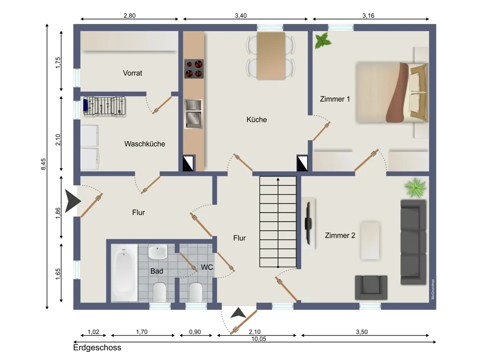 Sie betreten das Haus über die straßenseitige Eingangstüre. Im Eingangsbereich befindet sich die Treppe ins Obergeschoss. Zur Linken sind das WC und Badezimmer durch eine Zwischenwand räumlich getrennt. Die Warmwasseraufbereitung erfolgt über einen Holzofen mit Boiler. Gegenüber befindet sich das erste Zimmer mit einem praktischen quadratischen Zuschnitt. Durch das Zimmer hindurch gelangt man in ein weiteres Zimmer mit Kachelofenanschluss. Von diesem Zimmer aus erreicht man die große Küche. Durch die linke Türe gelangt man wieder in der Flur bzw. Eingangsbereich. Von dort aus kommt man in einen weiteren Flur mit Anschluss zur Waschküche und Vorratsraum.
